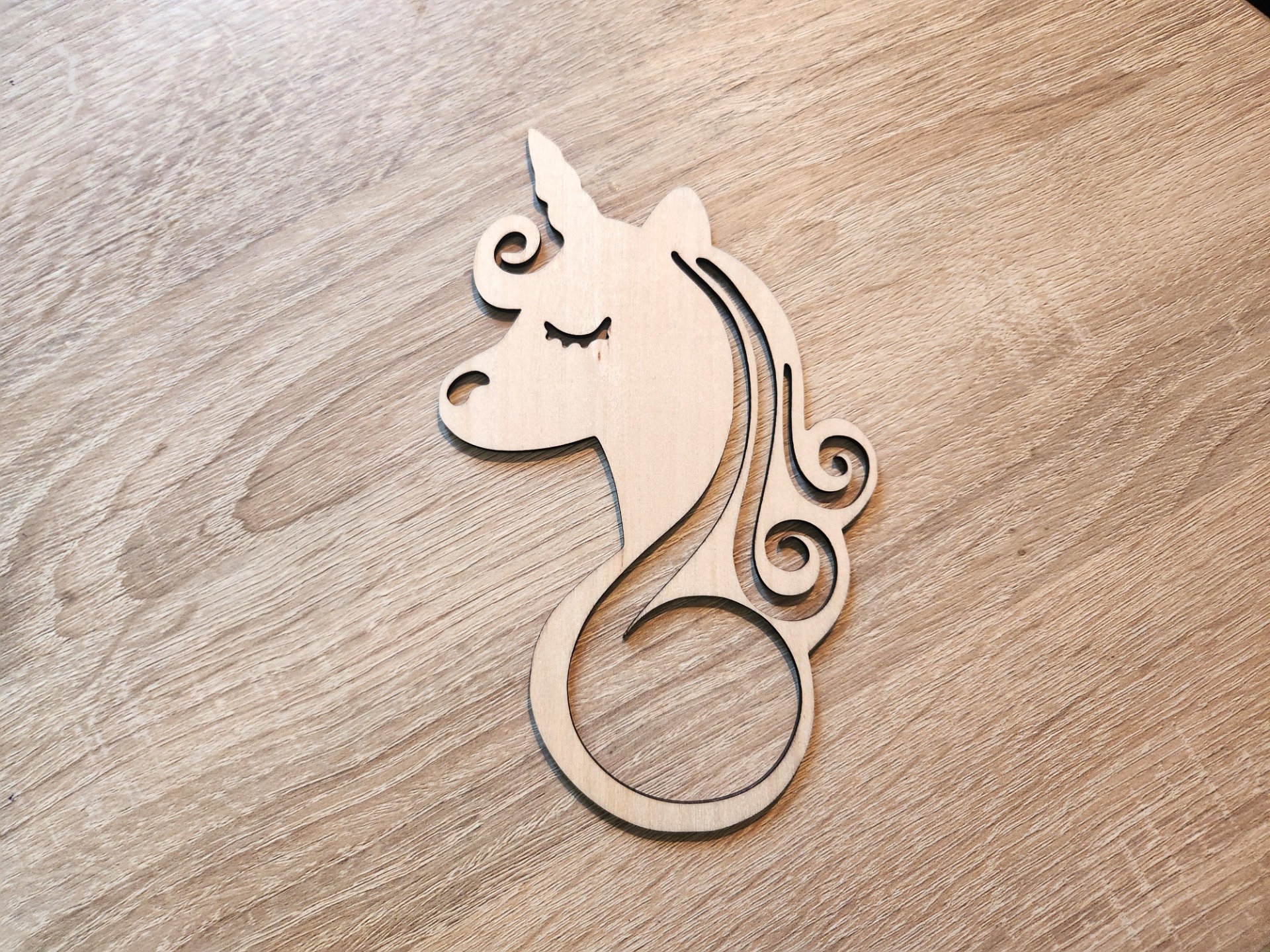Vyřezávaná hlava jednorožce z kvalitní březové překližky o síle 3 mm je krásnou přírodní dekorací na zeď pro všechny milovníky bájných bytostí.