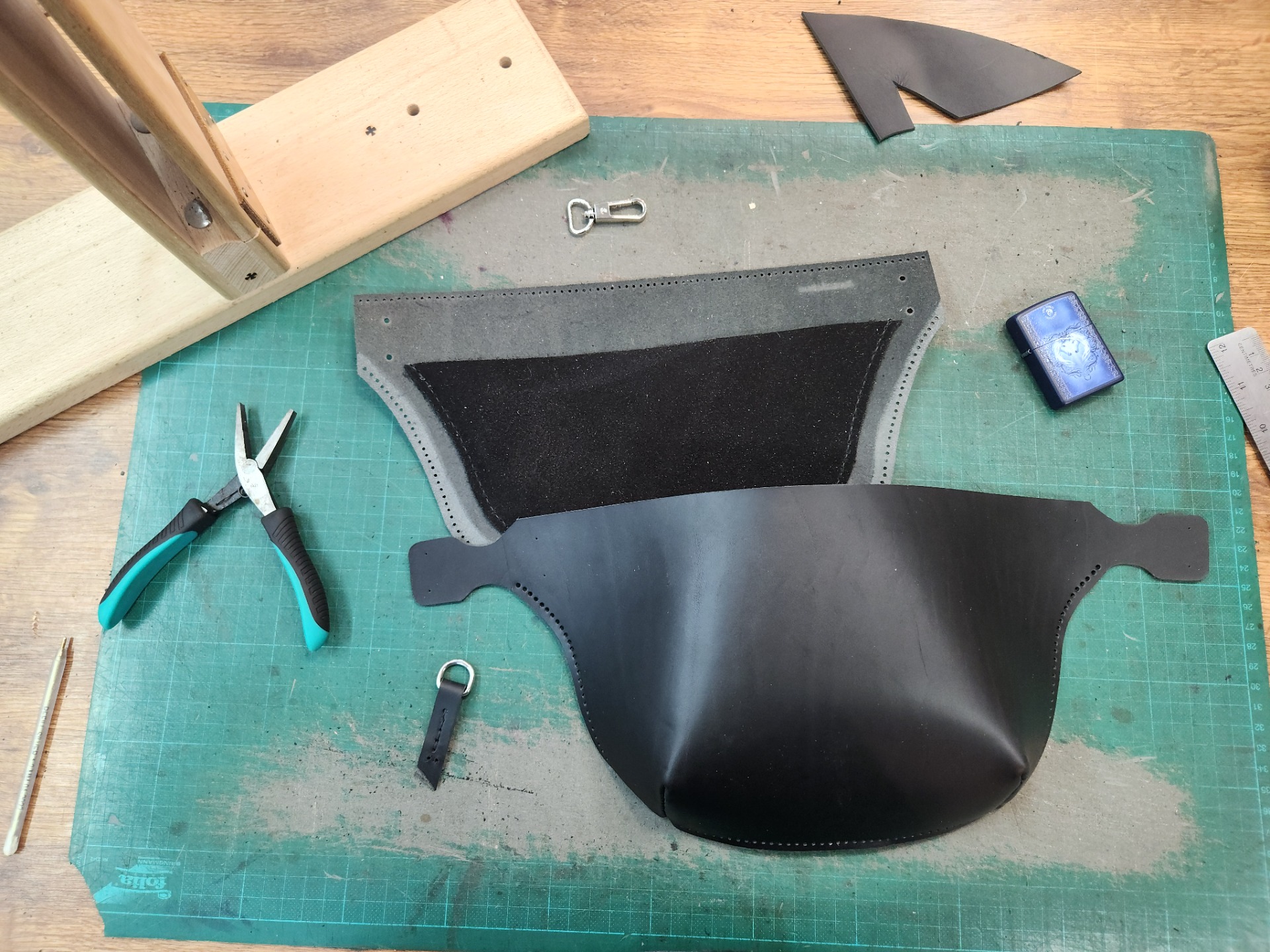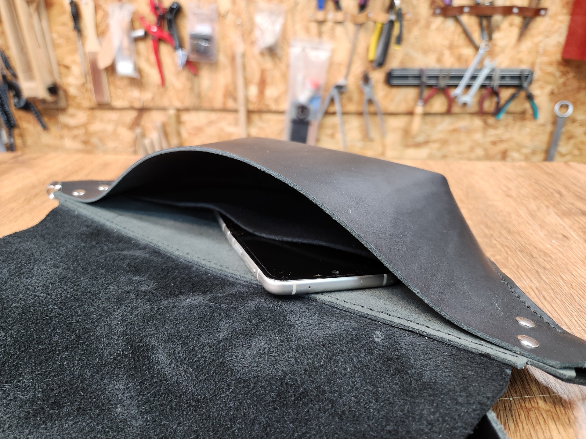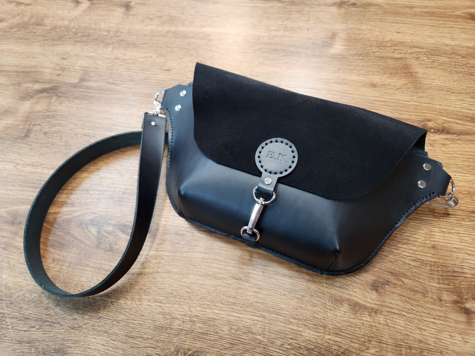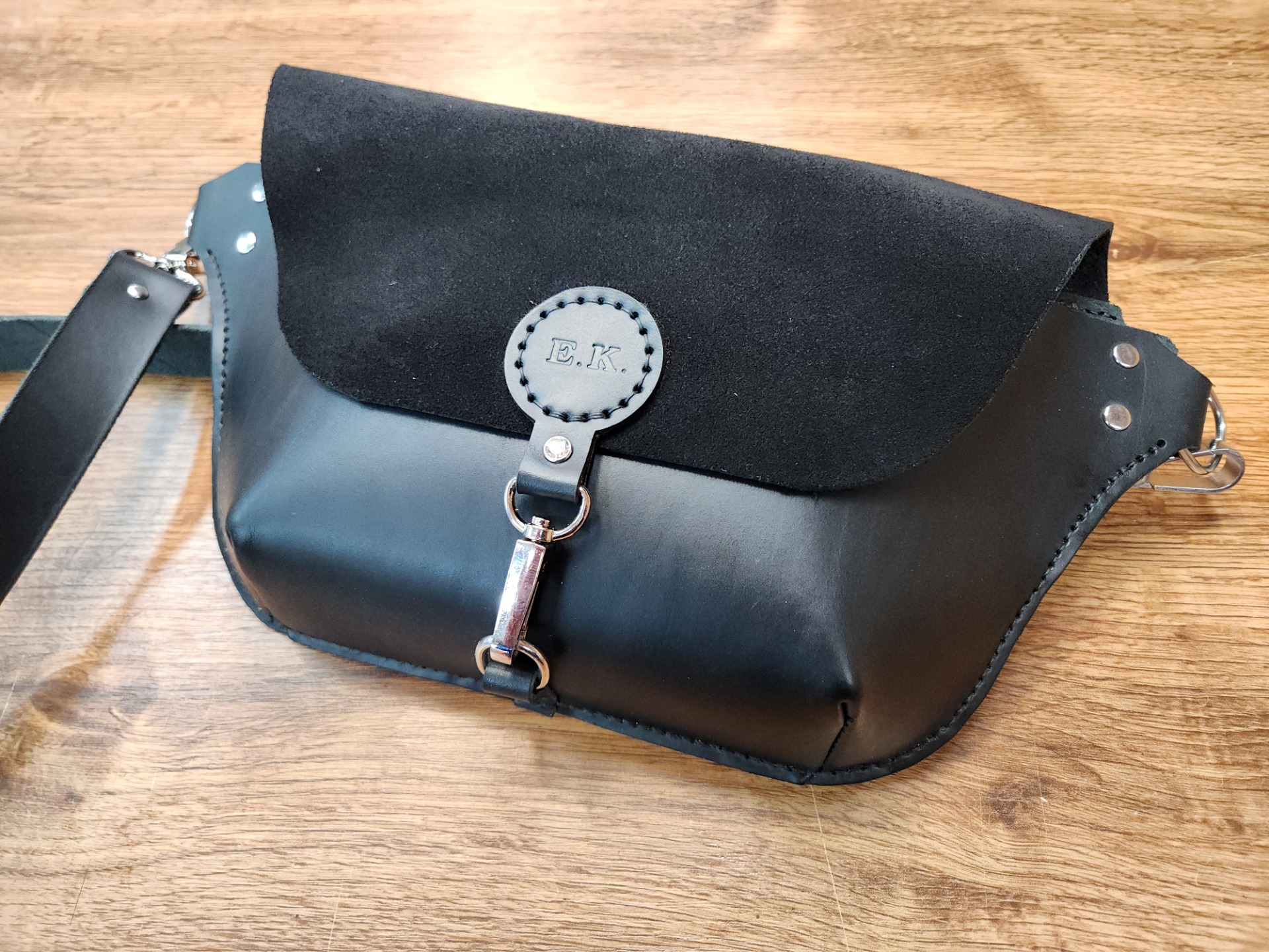 Stylová ručně šitá kožená ledvinka z kvalitní černé kůže, která spojuje eleganci hladkého povrchu s jemností broušené velurové kůže. Vnitřní kapsa z měkké velurové kůže chrání tvůj telefon a dodává příjemný dotek při každém použití.