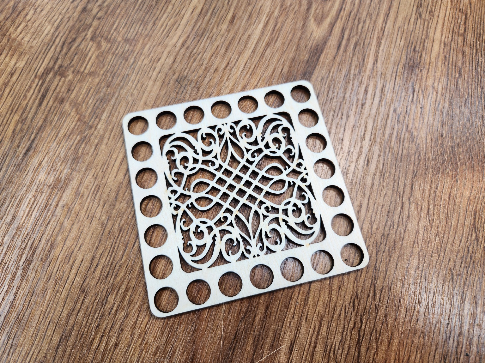 Elegantní čtvercové dno vyrobené z kvalitní březové překližky o síle 3 mm, ideální pro háčkované nebo pletené košíky. Vyřezávané motivy a průměr dírek 1 cm umožňují snadné propojení s různými materiály a tvoření unikátních košíků.