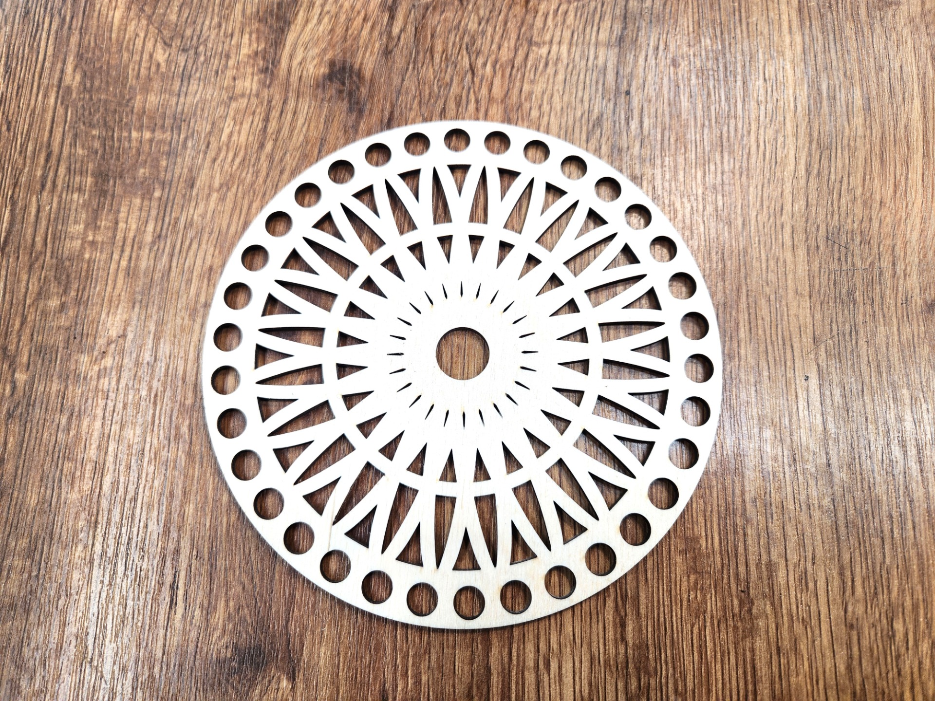 Praktické a dekorativní kulaté dno či víko vyrobené z kvalitní březové překližky o síle 3 mm je ideální pro háčkované košíky a další tvoření. Díky vyřezávanému vzoru a průměru dírek 8 mm se snadno kombinuje s různými materiály a háčkovanými vzory.